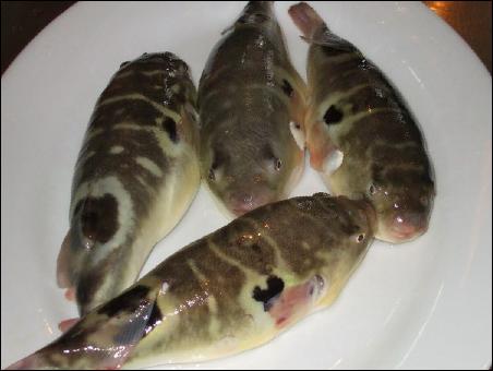 在我國(guó),河豚魚(yú)有30余種,常見(jiàn)的有黃鰭東方 、蟲(chóng)紋東方 、紅鰭東方 、暗紋東方 等,其中以暗紋東方產(chǎn)量最大。一般體長(zhǎng)70—500毫米,其中紅鰭東方豚已見(jiàn)最大體長(zhǎng)為750毫米。 河豚魚(yú)味道極為鮮美,與鰣魚(yú)、刀魚(yú)并稱為"長(zhǎng)江三鮮”。下面給大家看看一組河豚的照片:
