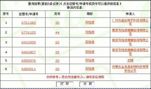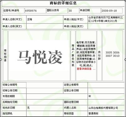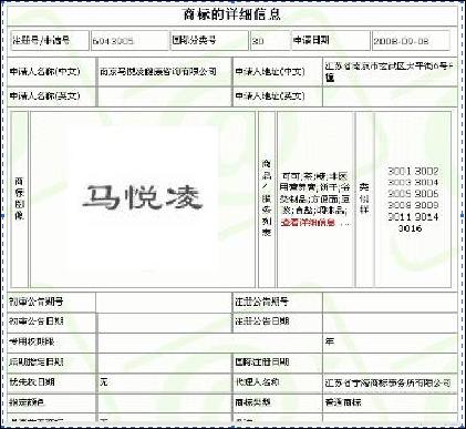 首先看“馬悅凌”商標(biāo),點(diǎn)擊后看到如下查詢結(jié)果: