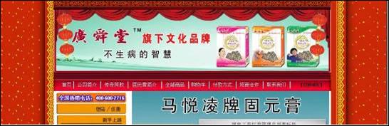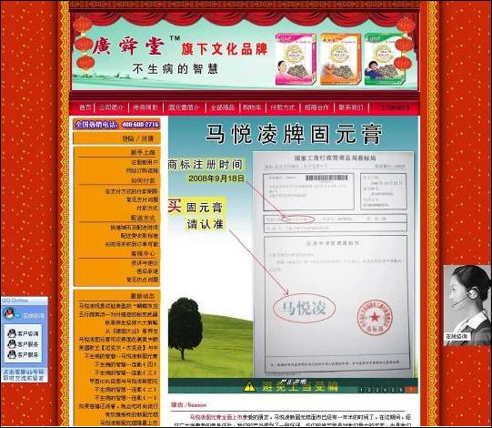 只見這家名為廣舜堂的網(wǎng)站上赫然打出了馬悅凌牌固元膏的字樣,而且也有品類齊全的“馬悅凌牌”系列產(chǎn)品。更令我氣憤的是還有這個,把一張蓋著國家工商總局商標局大印的受理通知書的圖片放在了首頁的位置,前面我已經(jīng)詳細解釋了受理通知書的法律意義,想必大家都已經(jīng)了解,而這家網(wǎng)站,把“申請時間”,混淆為“商標注冊時間”,這種虛構(gòu)事實的做法從主觀上講是赤裸裸的欺詐,簡直是在侮辱大家的智商!??!