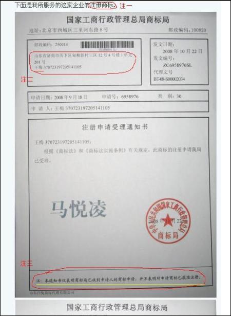請看注二,原來是山東的王梅“同學(xué)”,而注一左側(cè)這段話就是某位營銷專家講的,也說是“注冊商標”,但是請大家看看注三,雖然不是很清楚,但是黃線部分的字是看得清清楚楚的:“注:本通知書僅表明商標局已收到申請人的商標申請,并不表明所申請商標已獲準注冊”,簡直是睜著眼說瞎話,欺騙消費者!