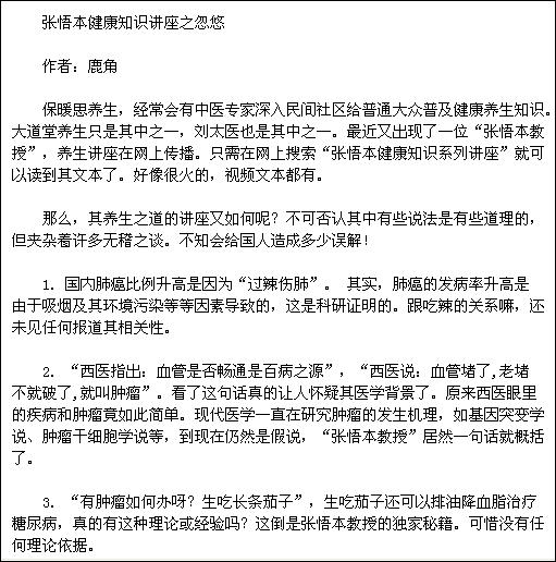 那張悟本到底是不是騙子呢?自張悟本成為了名人之后,質(zhì)疑之聲就從來沒有間斷過,大家可以上百度,搜索一下“張悟本”三個字,會看到這樣一個來自于百度貼吧的帖子:http://tieba.baidu.com/f?kz=616112597,題目是:張悟本健康知識講座之忽悠,作者:鹿角。下面我摘幾段給大家看看: