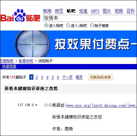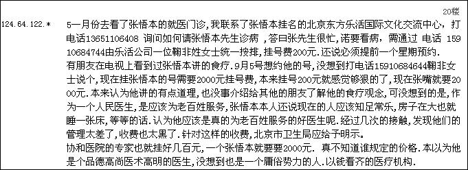 我們在搜索經(jīng)悟本的相關(guān)資料時,發(fā)現(xiàn)了這樣一個帖子,很有意思:http://zhidao.baidu.com/question/117572188.html,當有網(wǎng)友尋問張悟本在哪門診時,一個網(wǎng)友給出了這樣的答案: