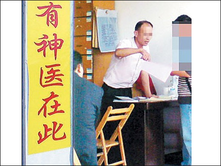 “那個(gè)‘神醫(yī)’承諾說包治愈才收錢,現(xiàn)在我們治療了一段時(shí)間都沒效果,他卻一再要我們交錢。而且,‘神醫(yī)’還招收學(xué)徒,我們覺得他是在騙人?!币皇忻駪岩勺约罕弧吧襻t(yī)”蒙騙后日前向本報(bào)投訴。記者隨后進(jìn)行調(diào)查采訪發(fā)現(xiàn),所謂的“神醫(yī)”自己承認(rèn)沒有執(zhí)業(yè)醫(yī)生資格,但卻吹噓自己能醫(yī)治一些正規(guī)醫(yī)院都束手無策的106種疑難雜癥,還說出 “死人也能救活”等“雷人”狂言。12月15日,南寧市衛(wèi)生監(jiān)督所工作人員就此表示,待他們調(diào)查后,如發(fā)現(xiàn)對(duì)方確實(shí)是非法行醫(yī),將按規(guī)定進(jìn)行嚴(yán)肅查處。