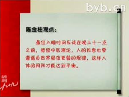 下面這段視頻,是2009年3月,陳金柱在山東農(nóng)科頻道《活到99》系列養(yǎng)生節(jié)目中,主講的“誰動了我的睡眠”片斷。在談到睡眠時,陳金柱特地強調(diào)了,人要順應天時,一定要在晚上11點之前躺在床上,而不是睡夠了8個小時就可以的。下面來看陳金柱的視頻。