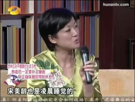 【byb.cn XJ】 2010年1月13日,有“健康教母”之稱的馬悅凌,在做客湖南衛(wèi)視百科全說欄目時,拋出了相當(dāng)雷人的觀點(diǎn)--熬夜沒事,只要你補(bǔ)足了覺就行,只要你吃好了就行。同時,她現(xiàn)身說法,說自己經(jīng)常在凌晨1-2點(diǎn)才睡,第二天上午睡到自然醒,啥事沒有。并且舉出毛澤東、宋美齡也經(jīng)常的熬夜來證明其觀點(diǎn)的正確。