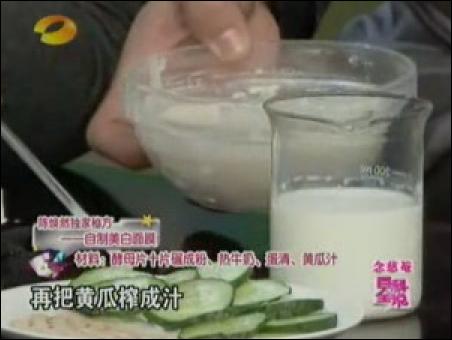 這個(gè)就是面膜的配方:10片酵母片磨成粉+熱牛奶+蛋清+黃瓜汁