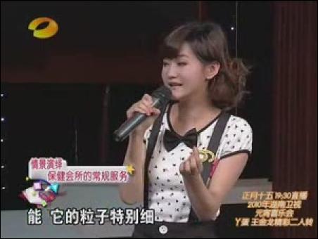 如上圖。大家還記得在1月27日,陳煥然第一次上百科全說節(jié)目時,那個天然美女--點(diǎn)點(diǎn)嗎?如今,她正式在新的百科全說中亮相,扮演了一名美容院的服務(wù)生,向方瓊推銷她的服務(wù)項(xiàng)目,包括干洗頭、精油按摩、泡澡等等,馬悅凌扮作方瓊的健康顧問,一一點(diǎn)破這些美容項(xiàng)目的騙人之處。