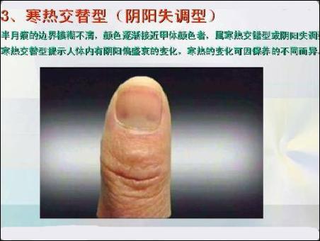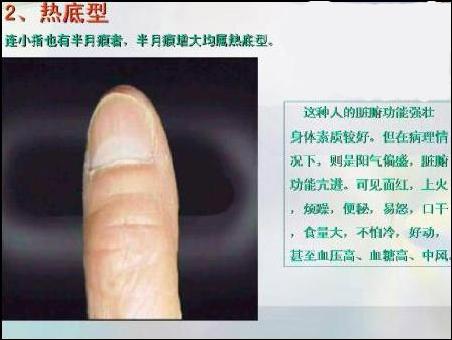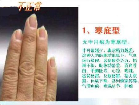前面已經說了,大部分陽虛的人,半月痕都比較小,或者沒有。體內的寒濕重,手腳容易冰涼,精力不旺盛,大便不成形。對于這類人群,主要是改善陽虛體質。主要做的工作有幾項,第一,是通經絡,找好的按摩師做經絡調理按摩;第二,是泡腳,具體的方法見本站首頁鏈接;第三,排毒,見首頁鏈接;第四,天天吃枸杞。我個人體會,堅持每天一小把枸杞,就像吃葡萄干一樣吃,大約吃2-3個月,你會明顯感覺效果,手腳再也不冰涼,精力旺盛,半月痕會逐漸長出來,顏色、形態(tài)都俱佳。