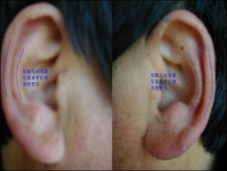 這個耳型的特點是,耳輪和對耳輪基本平行的,一直下來的這個,一般我們稱為腎型耳。說它怎么會型成這個的?是遺傳的呢?還是后天造成的,都不是,這個耳型表現(xiàn)是一個倒置的胎兒,就是你在子宮里頭什么樣,待的位置不同,就型成不同的耳型。所以說凡是出現(xiàn)腎型耳的人,70%容易得腰酸腿疼,夜尿多,腎不納氣,水腫,怕冷,這些疾病。
