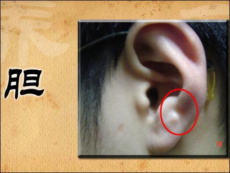 耳垂圓形凸起:在耳垂外上側(cè)有一圓形(鼓包中央凹陷)或丘形突起,多提示病人膽囊不適,可有口苦、膽區(qū)隱痛等癥狀,可見于膽結(jié)石、膽囊炎或膽囊切除的病人。(如下圖)