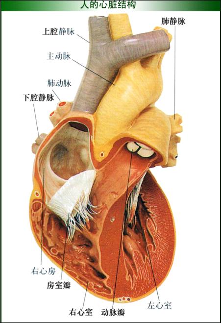 心臟的內(nèi)部分為:右心房、右心室、左心房和左心室四個(gè)腔室。