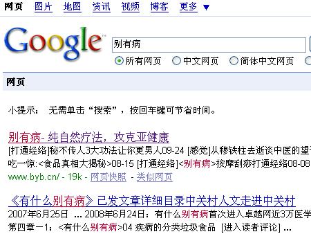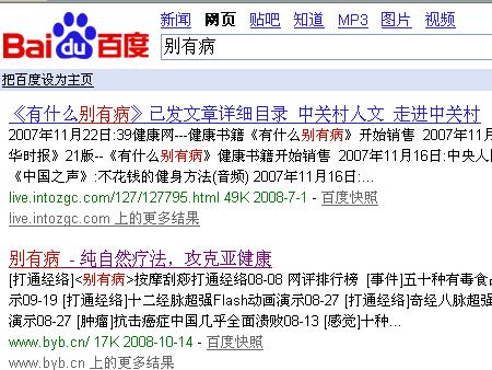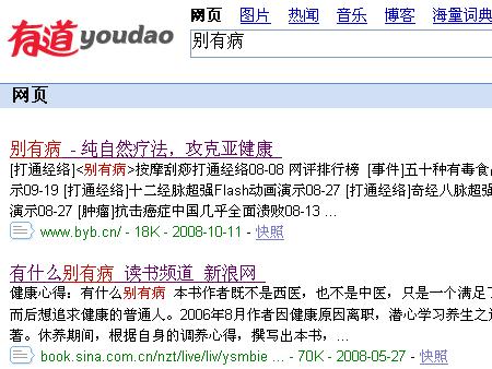 遺憾的是,像搜狗,雅虎,微軟等搜索引擎,還都無(wú)法正確的搜索到"別有病"網(wǎng)站,或者能搜索到,但排名較靠后.