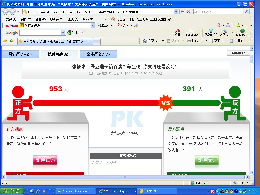 搜狐網(wǎng)最新調(diào)查顯示,1344人參加,支持張悟本的953人,反對的391人