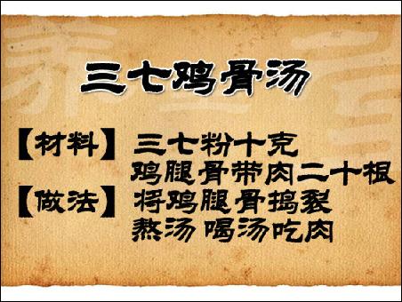 方子:三七雞骨湯。如果有跌打損傷,尤其是骨頭受傷骨折,就可用這個(gè)方子。取三七粉10克,把雞腿肉剔掉,取骨頭,用刀背把骨頭砸碎,然后用這骨頭碎和三七粉熬湯。每天喝這個(gè)湯,骨骼愈合的速度會(huì)加快,能減輕患者的疼痛感。