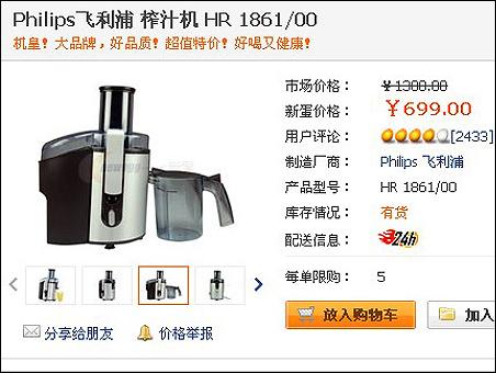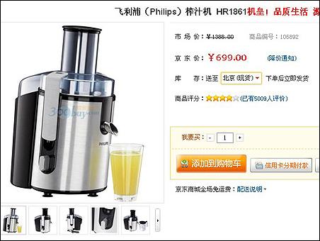 【byb.cn】好消息,飛利浦1861榨汁機現(xiàn)在已經(jīng)跌至700元以下,由于新蛋和京東兩家大型的電子商務(wù)網(wǎng)站商品價格一直相互血拼,導(dǎo)致這款高性能的榨汁機價格持續(xù)下降,目前價格已經(jīng)跌到699元了。比前一段時間的775元,又便宜不少,機會難得,這是近幾個月來的最低價,需要的朋友,請抓緊時間購買。