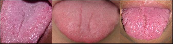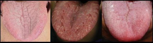 裂紋舌一般有兩種類型,一種稱為葉脈舌,在舌背中央有一條前后走向較深的的縱形裂溝,兩側旁又分出有許多橫向排列的比較規(guī)則的副溝側支,狀如葉脈;一種稱為腦紋舌,舌背可見有如大腦溝回狀的裂溝,迂回彎曲于舌背,狀似大腦的回紋,舌體稍大,兩側舌緣可出現(xiàn)齒印。裂紋少而淺的患者一般無明顯癥狀,舌體柔軟,運動自如,味覺正常存在;而裂紋深者,溝裂中并無舌苔覆蓋,溝裂中易滯留食物殘渣與微生物而引起舌的炎癥,水腫及刺激性痛;如果反復感染發(fā)炎后,舌體可逐漸增大肥厚,舌緣可出現(xiàn)齒印;長期的舌體裂紋也可能導致舌部營養(yǎng)失衡,舌面萎縮、光滑變小。