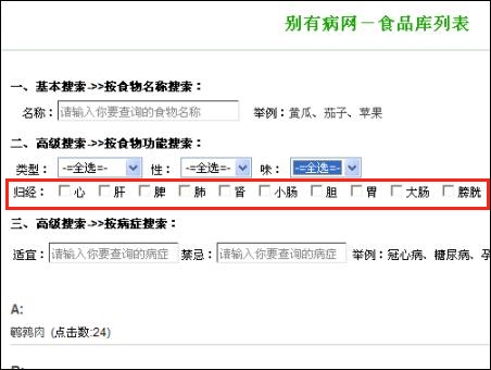 ②高級(jí)查詢一,按食物的“性味歸經(jīng)”查。