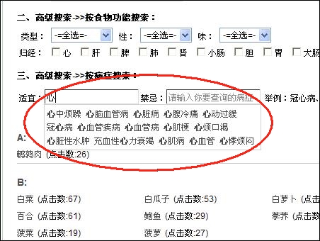 ?、?strong>高級(jí)查詢功能二,按適宜、禁忌查。很多網(wǎng)友現(xiàn)在得的病的名稱,都是西醫(yī)的名稱,叫的也不規(guī)范,比如,高血壓,也可稱為血壓高,也可稱為心腦血管病,但不管你叫什么,只要你輸入一個(gè)關(guān)鍵字,系統(tǒng)就會(huì)自動(dòng)提示你在本庫(kù)中的相關(guān)的病名,你點(diǎn)中想要查的病就行了。