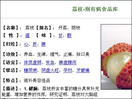 比如,在“適宜”一項(xiàng)中,點(diǎn)“貧血”,你就會(huì)查到,哪些食物,同荔枝一樣,同樣適宜貧血的人吃。再如,在“味”項(xiàng)中,點(diǎn)擊“酸”,你點(diǎn)擊,同樣也會(huì)查到更多與荔枝一樣味酸的食物。
