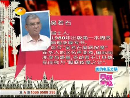 在10月4日晚恢復(fù)播出的百科全說首期系列節(jié)目中,節(jié)目組安排了有“足底按摩之父”之稱的老外-瑞士人吳若石和國際醫(yī)科交流大學(xué)傳統(tǒng)醫(yī)學(xué)博士鄭英吉,共同為大家做講解足底按摩之道。
