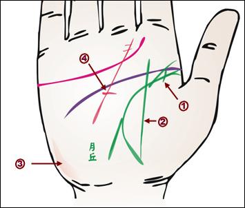 生命線始端分岔,常見于孩童時代腦疾患。有副生命線,這因身體麻痹,多用手動作而起的。中風(fēng)及腦腫瘤的人也常見。月丘靠手腕處肌肉繃緊隆起,是用手而肌肉發(fā)達(dá)現(xiàn)象。掌中央十字,表示依托宗教信仰來解病困。