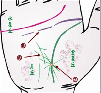 感情線上有許多細短線橫切。水星丘脹高,多縱橫小紋且模糊不清。此處的感情線通常較薄或有斷口。健康線含糊而淺,有岔線。金星丘或月丘發(fā)紅,有紅、紫、茶色斑點。