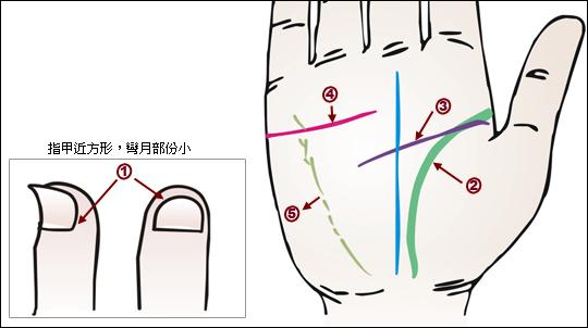 若指甲或平或上反曲而薄,往往見于因吐血、便血所致的貧血及營養(yǎng)不良。生命線欠緊湊,松弛而幅寬。智慧線短而欠圓曲。感情線短而缺乏變化,近于直線。健康線斷口及波狀增多。