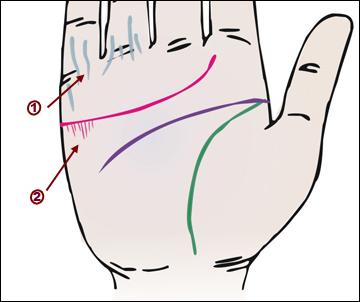 手掌色變紫、尾指、無名指浮現(xiàn)青筯,系感冒發(fā)熱前兆。感情線上靠尾指處出現(xiàn)縱縱線,多生喉病,有喉頭癌的可能。