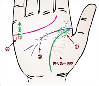 智慧線上也有小線叢集,隨后向下延伸,但因發(fā)作妨礙身心發(fā)育,故延伸過程中有斷口。水星丘感情線下有無數(shù)小縱線并列。