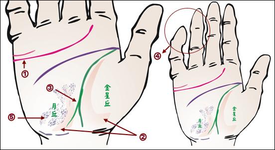 掌肌滑溜溜的,多有風(fēng)濕病。手指關(guān)節(jié)腫而痛。感情線起點處成雙,多有痛風(fēng)。金星丘、月丘的隆起肌肉很瘦薄,筋力不足。生命線末端分叉成兩股,末端擴散,表示風(fēng)濕晚期行走有問題。尾指、無名指不能自由屈伸,老是彎曲,是風(fēng)濕性神經(jīng)麻痹。手腕周圍到月丘下,出現(xiàn)暗紫黑斑,通常是風(fēng)濕癥腰部障礙,腳踝內(nèi)側(cè)也會呈現(xiàn)類似色調(diào)。