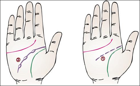 腦震蕩或嚴(yán)重頸椎異常,手彎曲如猿手或鷹爪。智慧線斷口多,主頭痛癥,也往往表示記憶力衰退。智慧線上多島,主腦部疾患。
