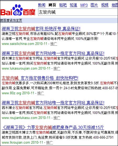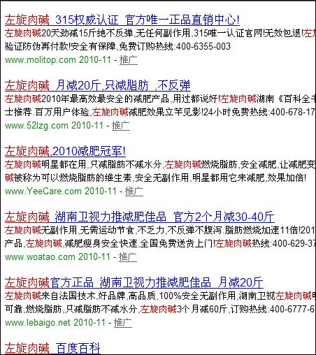 在百度的網(wǎng)頁(yè)搜索中,當(dāng)輸入左旋肉堿這個(gè)關(guān)鍵詞時(shí),竟然出現(xiàn)了多達(dá)10家的推廣鏈接,這應(yīng)該是百度能夠容忍的最大推廣數(shù)了,似乎你再也找不出,能比這個(gè)詞更火的推廣鏈接了。