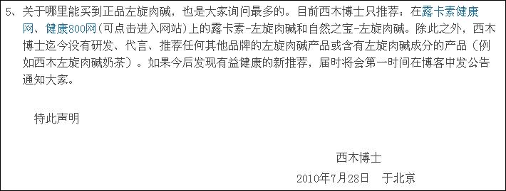 那么,真的像西木博士所說(shuō)的,他和賣左旋肉堿的商家無(wú)關(guān)嗎?非也,我們查閱了西木的博客(http://blog.sina.com.cn/s/blog_49ba101f0100jy49.html),發(fā)現(xiàn),西木并非是想把所有的賣左旋肉堿的商家打翻在地,再踏上一萬(wàn)只腳,而是他只推薦了兩家網(wǎng)站是正宗的,換言之,這兩家兩站賣的左旋肉堿,是西木認(rèn)可的,看下面的截圖: