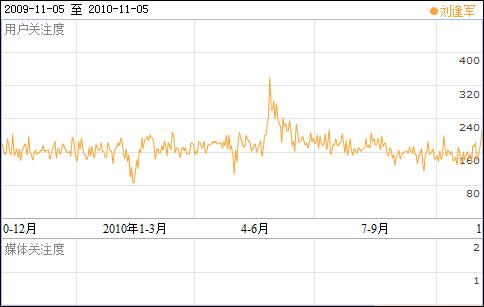 劉逢軍百度指數,2010年5月28日,指數一度高達340點,11月5日,為213點