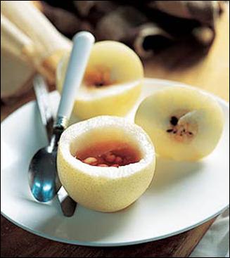 做法是將北杏10克,雪梨1個,白砂糖30~50克,同放碗中,加適量清水,隔水蒸熟(1小時)即成。喝湯吃梨,常食有效。