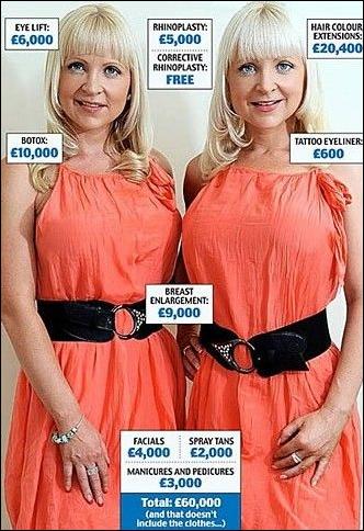 無法辨認的雙胞胎:有些雙胞胎干什么都保持一致,一起生水痘,一起去練芭蕾。而喬和凱利這對雙胞胎姐妹可以說把這種“一致性”做到了極致:當喬決定去做鼻子整形手術(shù)時,凱利也跟著一起做了。從這以后,姐妹倆做了一系列整容手術(shù),共花了6萬英鎊,而且兩人選擇的醫(yī)生都一樣,并且在相同的時間、做同樣的手術(shù),這一切都是為了讓她們保持一模一樣、無法區(qū)分。