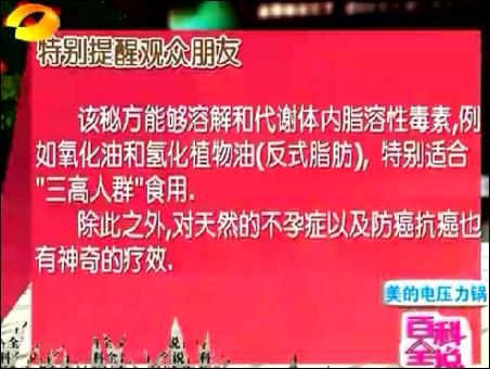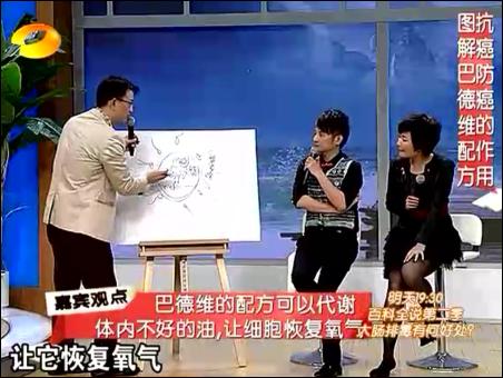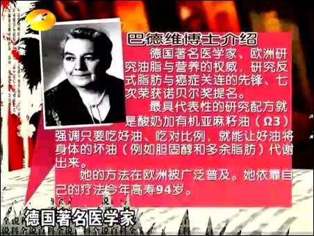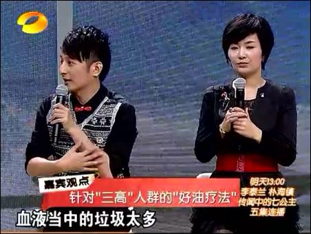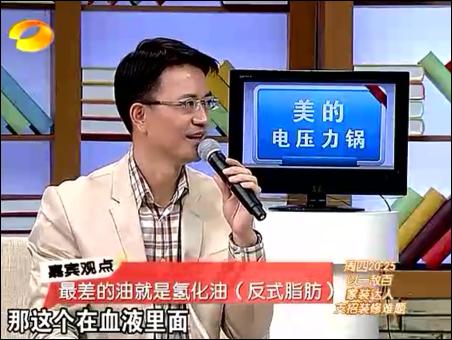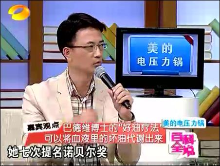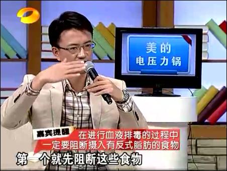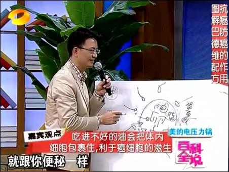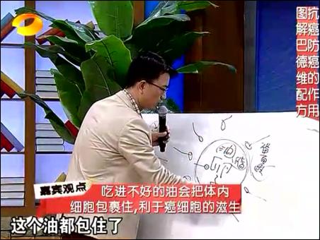 在11月30日的節(jié)目中,王明勇主要講解了對(duì)“三高”(血壓、血脂、血糖)人群如何進(jìn)行排毒。那就是三高人群主要是在食物中,攝入過(guò)多的反式脂肪造成的。這些反式脂肪,無(wú)法被人體所代謝,因而會(huì)造成我們細(xì)胞活力的下降,造成血液里的垃圾過(guò)多。王明勇主要介紹采用馬德維博士的亞麻籽油+酸奶的排毒法。他認(rèn)為,只有油才能溶解油,比如身上沾了機(jī)油,要用汽油去溶解一下,因?yàn)閬喡樽延椭校袣W米咖3不飽和脂肪酸,因而可以代謝掉不良的油脂,尤其是返式脂肪。