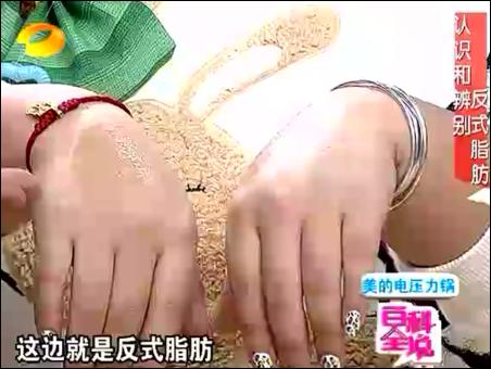 臭皮垞的左手,涂的是亞麻籽油;她的右手背上涂的是反式脂肪(很亮,不被吸收)