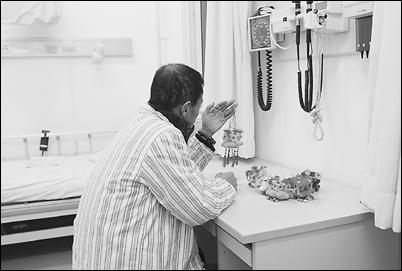 在北京佑安醫(yī)院的一間病房里,來自山西的艾滋病患者老紀在擺弄從家鄉(xiāng)帶來的手工藝品