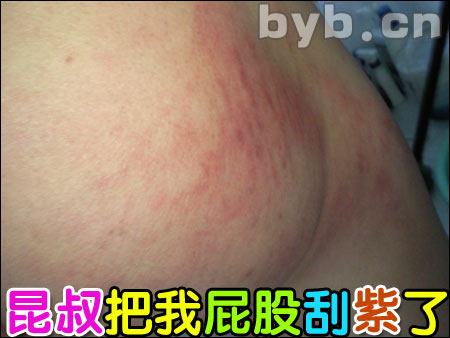 【byb.cn 大道至簡(jiǎn)】很多人都做過(guò)刮痧,經(jīng)常做的部位,如后背、大腿、胳膊、肚子,可很少有人刮過(guò)屁股,也就是臀部,為什么呢?因?yàn)槠ü傻白尤馓窳?,刮痧很難把深層次的東西給表出來(lái)。但是,前些日子去找昆叔按摩,他居然把我的屁股給刮出很多痧來(lái)。這到底是怎么一回事呢?