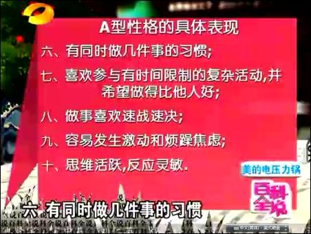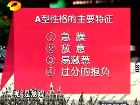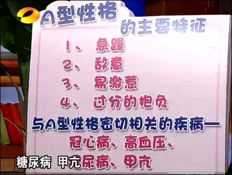 在20日的節(jié)目中,何裕民重點介紹了A、B兩種性格類型人易得的疾病,以及如何調(diào)理。