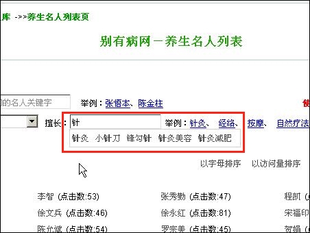 比如,我們在查賀普仁時,在擅長這塊,會出現(xiàn)“針灸”這個關(guān)鍵字,那我們點擊“針灸”這個字時,還會出現(xiàn)其他擅長針灸的名人,比如程凱、傅杰英的名字,這樣就便于用戶自己去選擇。同時,在輸入框中,輸入“針”,也會出現(xiàn)相關(guān)聯(lián)的查詢詞匯。