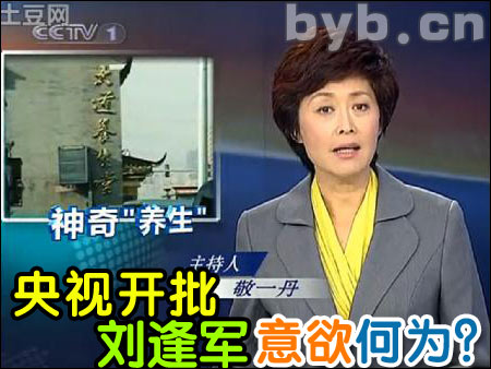 【byb.cn XJ】 2010年12月29日、30晚,央視一套《焦點(diǎn)訪談》和新聞?lì)l道新聞1+1,開始炮轟北京大道堂劉逢軍,各大媒體也紛紛轉(zhuǎn)載了此消息,大有張悟本事件重來一遍的勢頭。詳細(xì)新聞,請看相關(guān)文章:http://zipl.cn/doc_2394.aspx