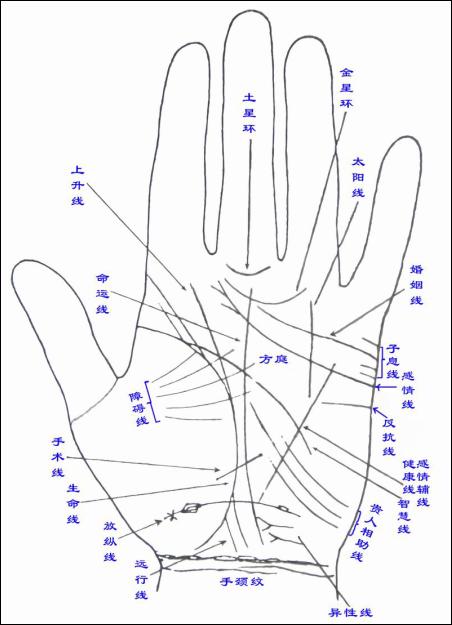 【障礙線】:所有橫切各主線或某些輔線的不正常紋線都可稱(chēng)為障礙線,位置不固定。當(dāng)障礙線細(xì)、短、淺時(shí)病理意義不大,線深刻而且長(zhǎng)度超過(guò)一厘米時(shí),就有病理意義了。一般預(yù)示近期健康狀況。