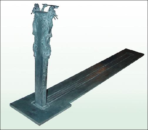 圭表這種天文儀器,由圭和表兩部分組成。表,是直立的竿子(天安門、北大都有個(gè)特殊的表,叫華表);圭,是平臥而標(biāo)有刻度并與表相連的部分,二者垂直,便組成了簡單而實(shí)用的天文儀器。表立在圭的南端,才會(huì)有日影投到圭上面,所以說“立端于始”。表的上端有一景符向外彎曲,景符中間有一圓孔。正中午時(shí),太陽的影子經(jīng)過圓孔射到圭面上。觀察日影的長短周期變化,就可以測知太陽的行程,校正時(shí)令節(jié)氣。