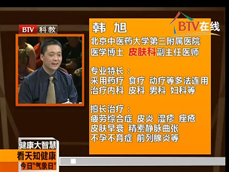 2011年3月24日,BTV科教頻道《健康大智慧》欄目邀請到了北京中醫(yī)藥大學第三附屬醫(yī)院皮膚科副主任醫(yī)師(韓旭)做客節(jié)目現(xiàn)場,與主持人及現(xiàn)場觀眾共同來聊聊正值春季,我們的身體會容易出現(xiàn)哪些問題,又應該如何調(diào)整呢?敬請收看!
