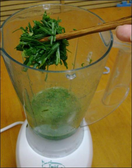 第四:將切碎的韭菜和剛才燙韭菜的水倒入攪拌機,攪拌成了糊就停,這時用紗布過濾就行了。