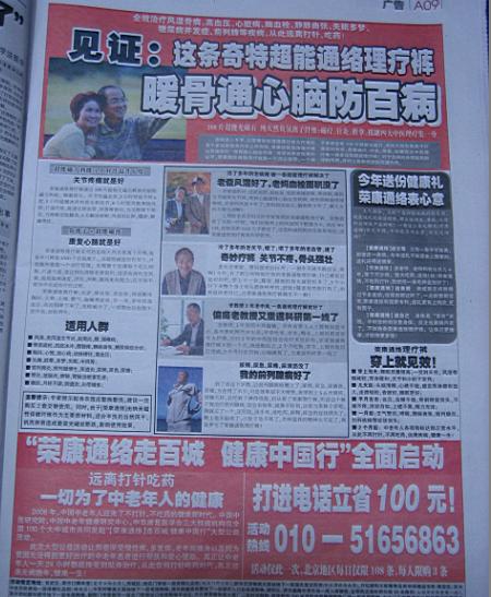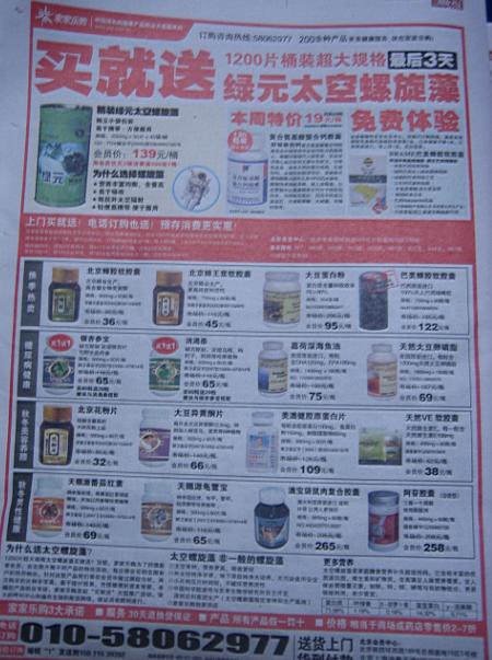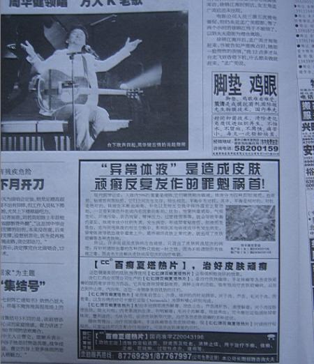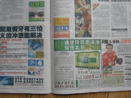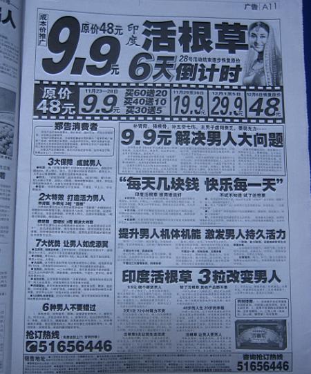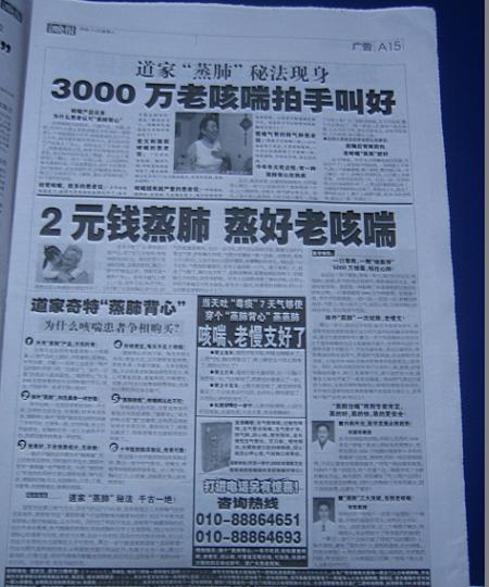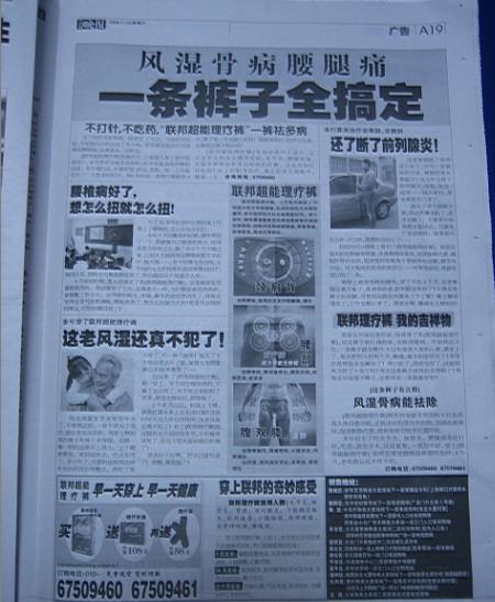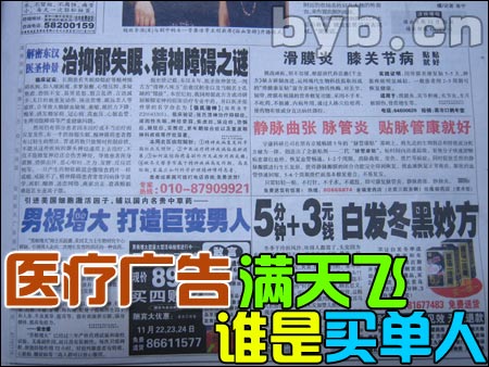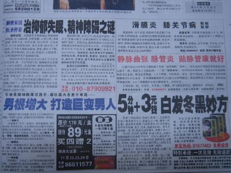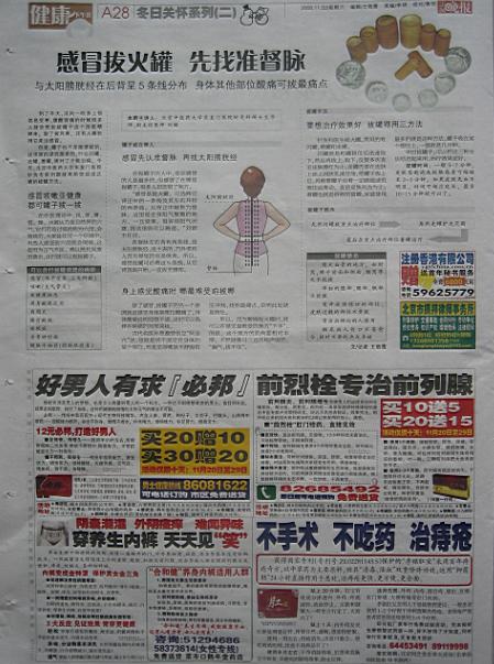 我家里也訂了一份,每天看看,確實(shí)也挺不錯(cuò)的.由于關(guān)注健康產(chǎn)業(yè),對(duì)報(bào)紙上的相關(guān)信息也留意了一些.但今天,真的給我驚著了,今天,2008年11月22日,周六,農(nóng)歷節(jié)氣是小雪.今天我看到<法晚>的32個(gè)版面,涉及藥品、保健品、醫(yī)療器械的廣告,將近8個(gè)整版,也就是說,僅醫(yī)療相關(guān)的廣告,就占了當(dāng)天報(bào)紙的四分之一,這還不算是其他的軟廣告內(nèi)容,以及其他內(nèi)容的廣告。