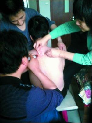 針尖沿著脊椎兩側(cè)的穴位不停扎入,李凱(化名)的表情因痛苦而扭曲,密密麻麻的針眼不停向外滲著黃色的液體。
