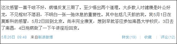從前面的文章中,我們就能看出,黃建始擔(dān)任了過多的職務(wù),導(dǎo)致其身體處于長(zhǎng)期透支的狀態(tài)。在其去美國(guó)前的幾天,他就得了感冒,并且反復(fù)不愈,這足以說明其免疫力極其低下。有其博客為證,下面是其5月26日在新浪微博連發(fā)四條感悟: